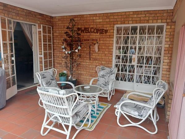 The living and dining area leads out onto a spacious covered patio overlooking the back manicured garden with braai facilities.