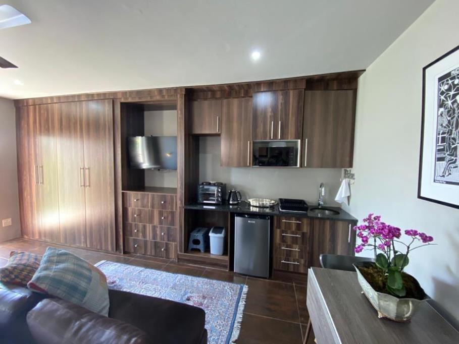 Step inside to discover six separate studio apartments, thoughtfully designed for self-catering convenience. Each unit is fully equipped with air conditioning, a cozy seating area, a kitchenette, and a private bathroom, ensuring a comfortable stay for guests. The expansive living space opens onto a charming deck overlooking a lush garden and inviting pool, creating a serene retreat for relaxation.
