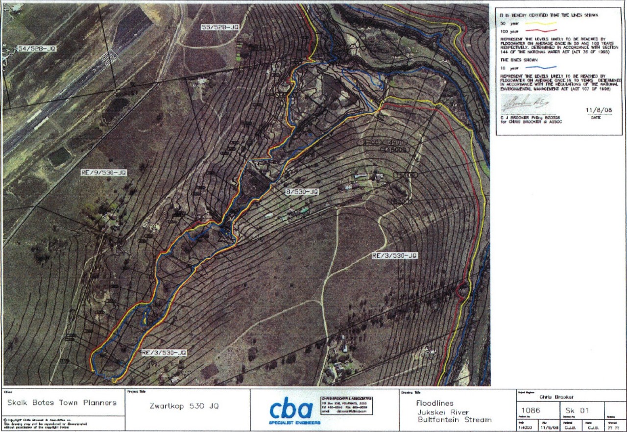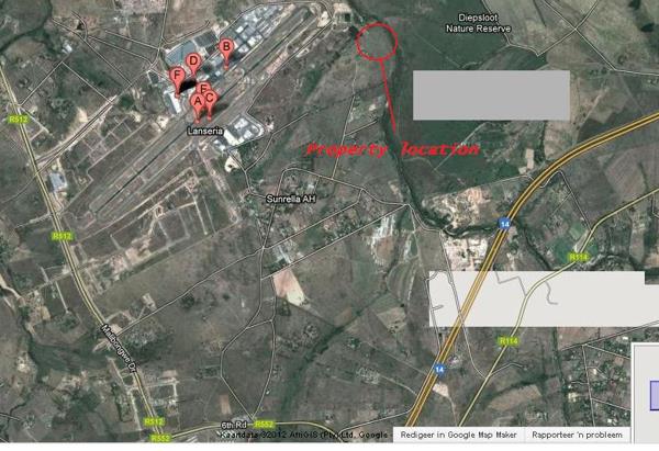 The property measuring 8.9902Ha, bordering onto the south eastern perimeter of Lanseria Airport has river frontage on the Jukskei river, and, due to the border falling in the centre of the river, water can be pumped directly from it. (The borders of most of the properties in the area fall short of the river and may therefore not pump directly).