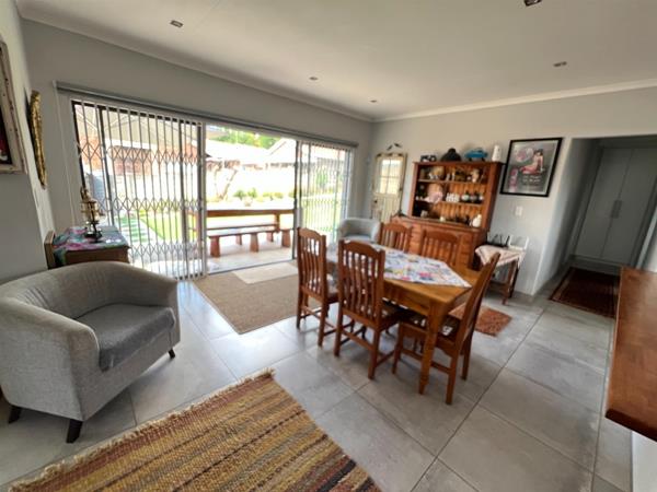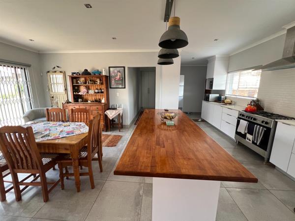 The property features an inviting open-plan layout that flows seamlessly from the living areas to the entertainment spaces. The kitchen is beautifully fitted with quartz countertops, ample built-in cupboards, a gas stove, extractor fan, and a separate scullery for added convenience.