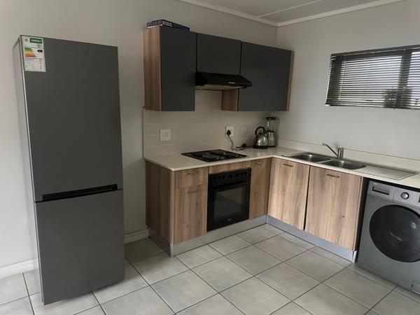 This stylish 1-bedroom, 1-bathroom apartment offers contemporary living in a sought-after Pretoria East estate. It features an open-plan kitchen with modern cabinetry, an oven and hob, flowing into a bright living area. The bedroom has built-in cupboards, and the bathroom is neatly finished with a shower, basin, and toilet. Tiled throughout, the apartment is low maintenance and ideal for young professionals or couples.
