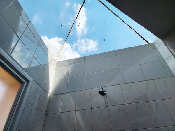 The bathroom features a skylight shower, allowing for plenty of natural light and showering under the stars.