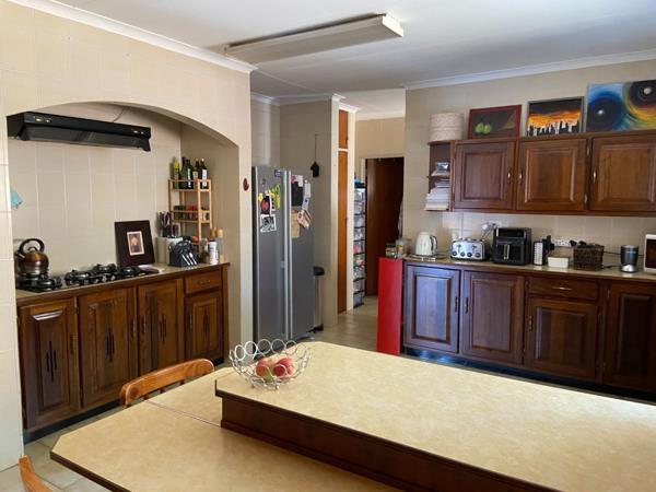 The solid Imbuia wood kitchen reminds one of an old FARMHOUSE size kitchen, with space for a double fridgefreezer and separate large scullerylaundry, FIVE PLATE GAS STOVE and separate PANTRY.