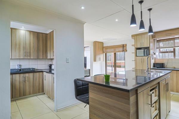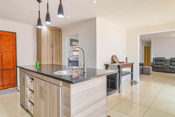 Entrance hall to tiled living area on the right and new DREAM kitchen with five plate ELBA gas stove, breakfast nook, cupboards galore, granite tops and separate scullery area.