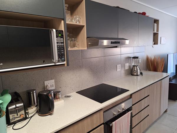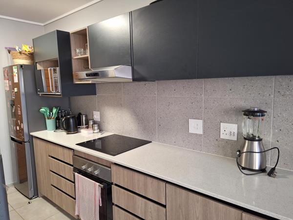 As you enter, youre greeted by a modern kitchen featuring ample cupboard space, tile flooring, a built-in stove, and dedicated areas for all your electrical appliances. The open-plan layout flows seamlessly into the tiled living area, extending onto a private patio and landscaped garden ideal for relaxation or entertaining.