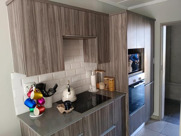 Both bedrooms have built-in cupboards. The full bathroom has modern fixtures and a clean, minimalist design.