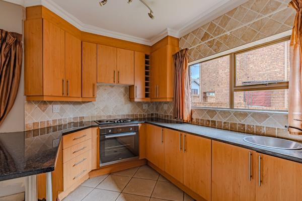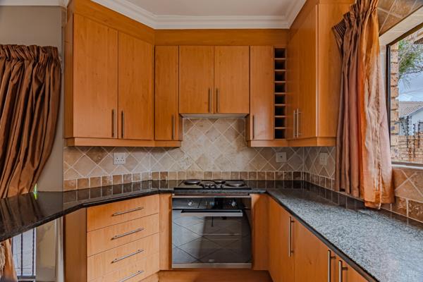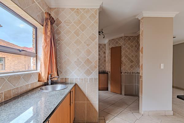 The kitchen has a sleek stylish look where modern design meets practicality. The granite tops offer both beauty and durability providing ample space for meal preparation. The cupboards provide plenty of storage space, creating a clutter-free environment. The spacious pantry adds to the kitchens functionality, offering extra storage space.
