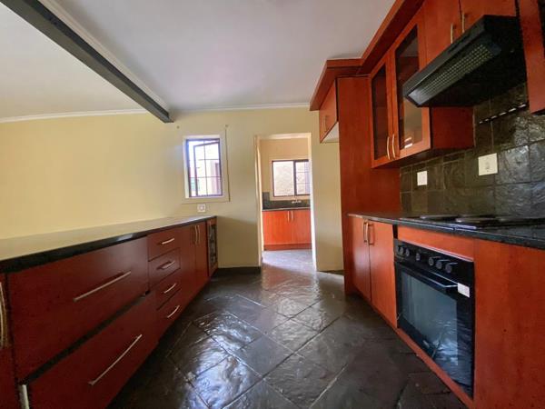 The spacious kitchen is well-equipped with an electric stove and oven, ample cupboard space, and a dedicated pantry. A separate scullery and washing area provide additional space for appliances and lead directly to the outdoor washing line and staff quarters.