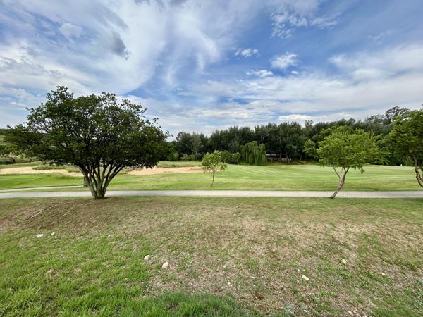 The property boasts walking paths at the rear, overlooking the scenic golf course and offering peaceful views of the nearby Crocodile River. The approach to the entrance is framed by tall, picturesque trees, adding to the tranquil setting.