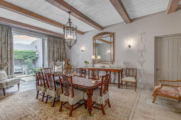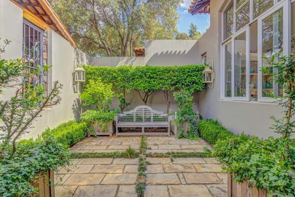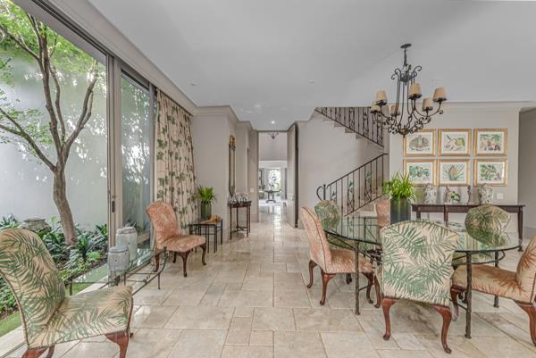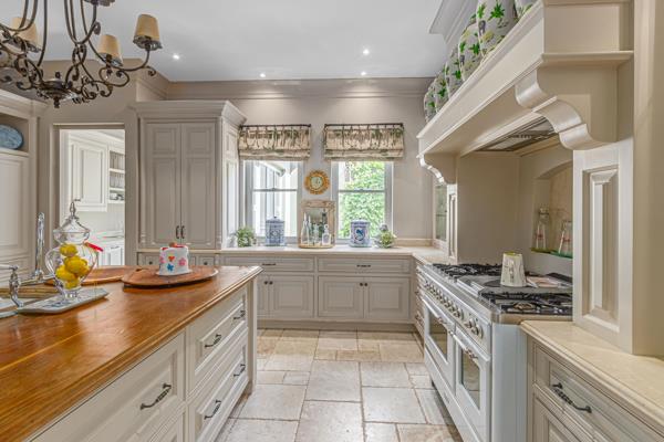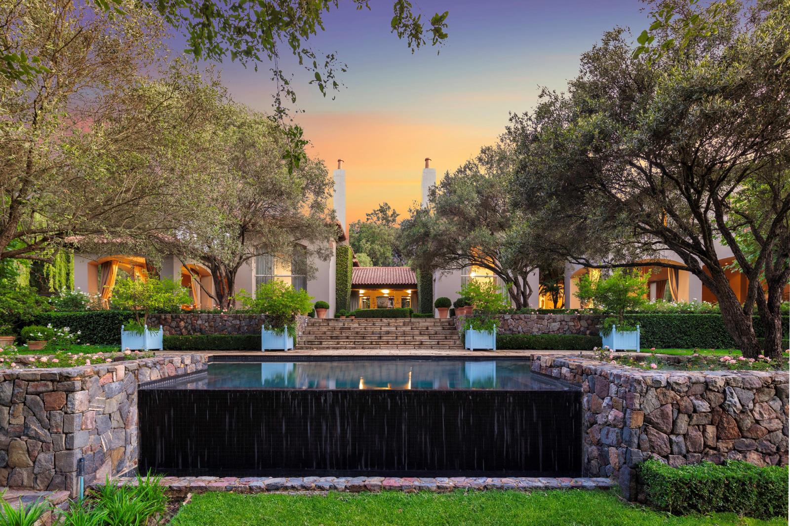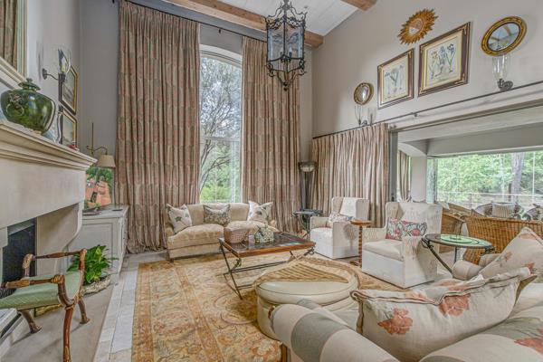 Step into this classic villa and be captivated with its beauty from the imported travertine floor tiles, roof tiles from Italy, crystal chandeliers and exterior stone brought in from India for the home. The property is split into two residences which are conveniently joined together but can be separated for complete privacy from one another. It is an ideal home for the multigenerational family where space is a requirement and multiple entertainment & relaxation areas are a must have. On one side of the property you will find three en-suite bedrooms upstairs, a grand gourmet country kitchen, beautiful central dining area, a champagne lounge and additional loungetv area all leading out onto the large covered patio with a built in concealed gas braai. There is a private dining room and lounge with extra high volume ceilings and a beautiful gas fire place. The kitchen leads to the brightest scullery area, which then takes you to the rose cuttingpotting room with doors opening onto the stunning rose garden. This home is unique with this beautiful room which has an accent piece rose chandelier. Then walk into a beautiful laundry room which is connected to one set of three garages. The outdoor courtyards lead to the 3 bedroom cottage which can be used as staff quarters or as a separate residence all together. On the other side of the home are two beautifully sized bedrooms en suite, a large office, kitchen, atrium and very comfortable loungetv room leading onto its own patio and deck looking onto the garden and waterfall. This side of the home is completed with the second triple garage.