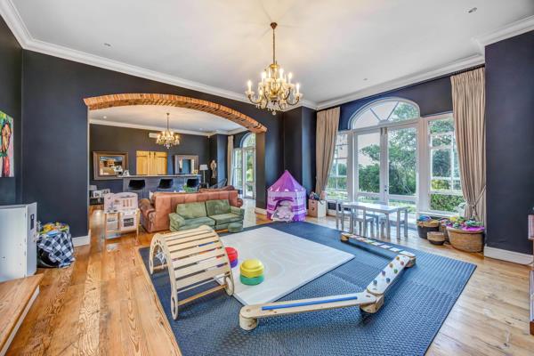 Upon entering, the heart of the home unfolds around a central entertainment space. To the left of the entrance, a stylish bar area with a private wine cellar sets the tone for relaxed evenings and effortless hosting. Adjacent to the bar is a versatile lounge area - currently used as a childrens playroom - ideal as a secondary lounge, study, or informal sitting room. A guest cloakroom is conveniently positioned nearby.