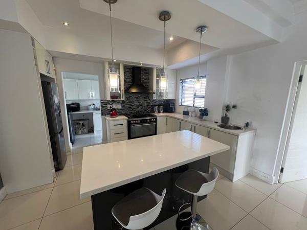 The modern open-plan kitchen and dining area is designed for effortless entertaining and everyday living. Featuring Caesarstone countertops, a gas stove, a scullery, and ample cupboard space, this kitchen is a chefs dream. The lounge with a fireplace flows seamlessly onto a covered and enclosed patio with sliding doors and a built-in braai, creating the perfect all-season entertainment area.