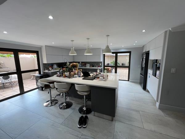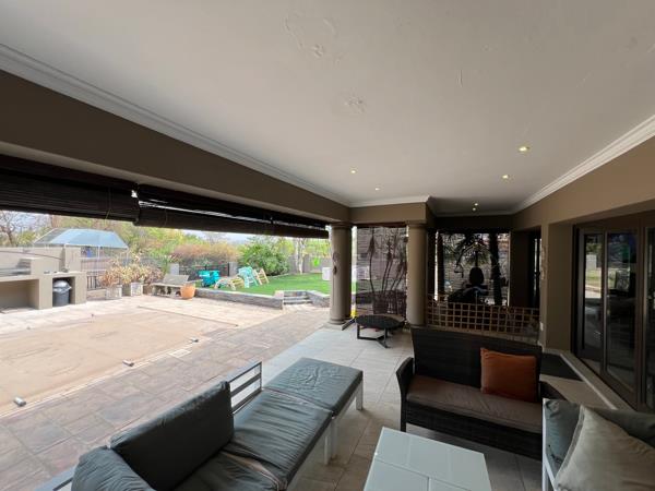 For those who love to entertain, the property features a separate bar area that opens onto a fantastic outdoor space, complete with a sparkling pool, braai area, and ample space for children to play. The front of the home also offers a large covered patio with a louvre roof, providing an excellent spot to enjoy the outdoors in any weather.