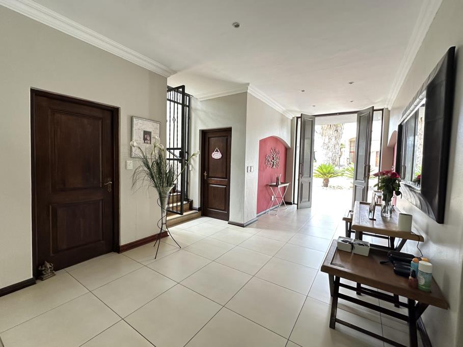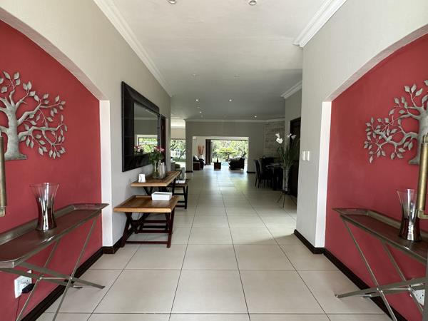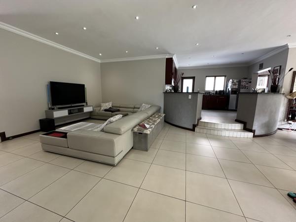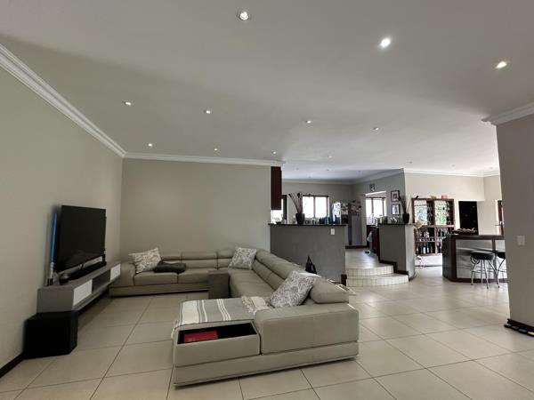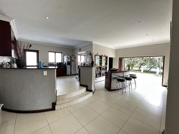 This spacious home has modern kitchen with dual gas and electric stove, space for a double fridgefreezer and scullery. The fully kitchen is centrally situated servicing the lounge, dining room and bar . The bar with a mini wine cellar opens out onto the pool area. The boma area is outside right next to the outside braailounge and pool. Ground floor also has a guest loo and study, double garage and a domestic quarters.