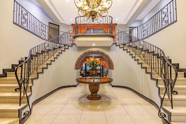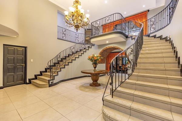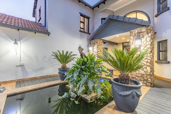 Step into a world of elegance and tranquility, where a serene koi pond with a charming waterspout sets the tone for refined living. Beyond the stone-clad pillars, an impressive foyer with soaring ceilings and a dazzling chandelier welcomes you, creating an unforgettable first impression.