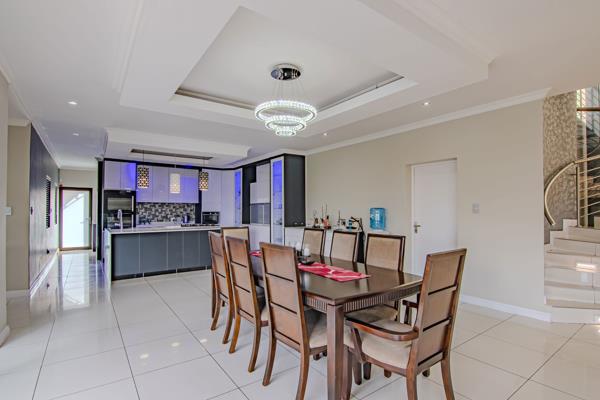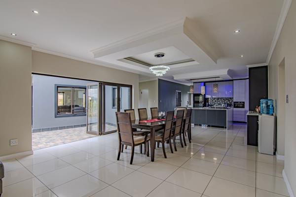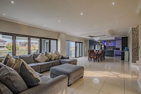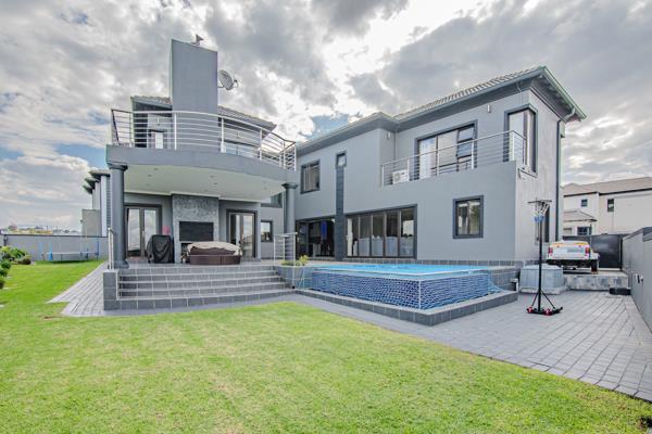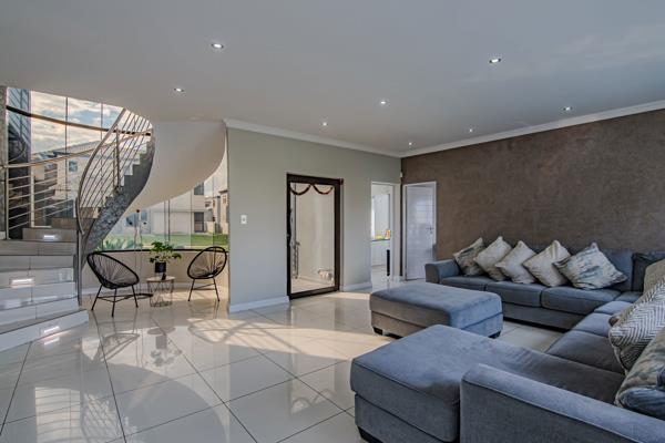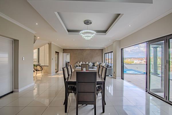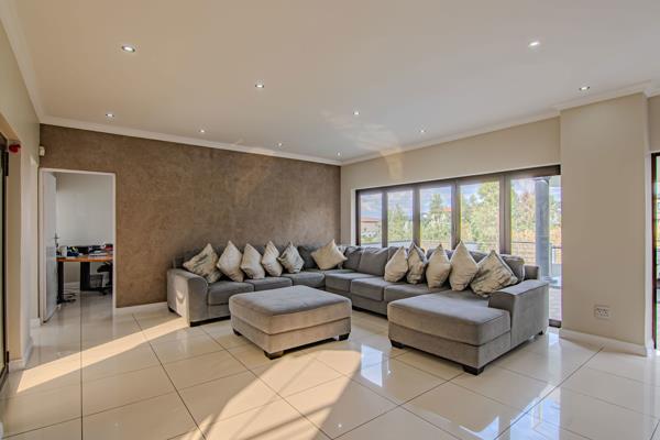 Superb Positioned. A warm welcome to the calmness and serenity of the home. With the entrance leading to the open planned living and dining areas, this also opens to the kitchen, with a centre island. The openness leads again to a passage way to the tv area with a projector. All the living spaces open to the backyard with beautiful garden, pool and lovely views. Downstairs features an office with built in cupboards and a prayer room, or second office if it pleases you. The kitchen leads to the scullery and pantry at the back. Your guests are treated to a guest en-suite, which opens the sliding door to the garden. Outside you have a Jojo tank for water reservation during those times of scarcity. Backup solar system with panels at your service.