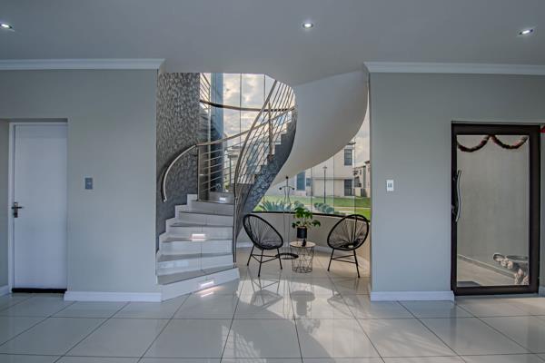 Upstairs features a master bedroom, with walkway to the bedroom wide and spacious, with en-suite and walk in closet. The balcony from the bedroom gives the most beautiful views of the estate, nature and pool area, going all around the bedroom. The pajama lounge caters for the entertainment of the kids. The kids'' bedrooms have walk in closets and en-suites. Very spacious and both have access to balconies.