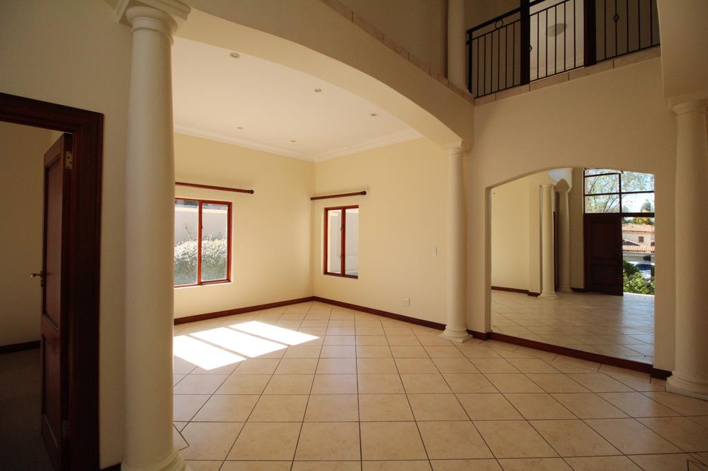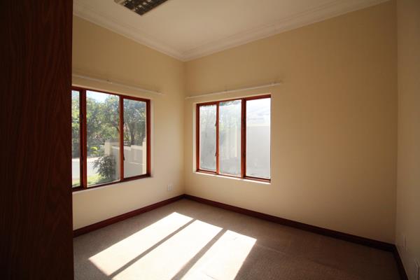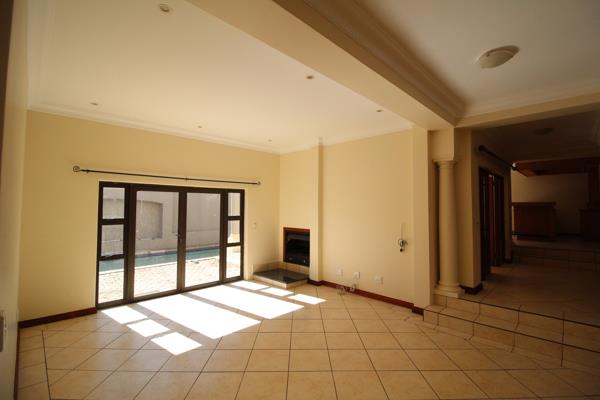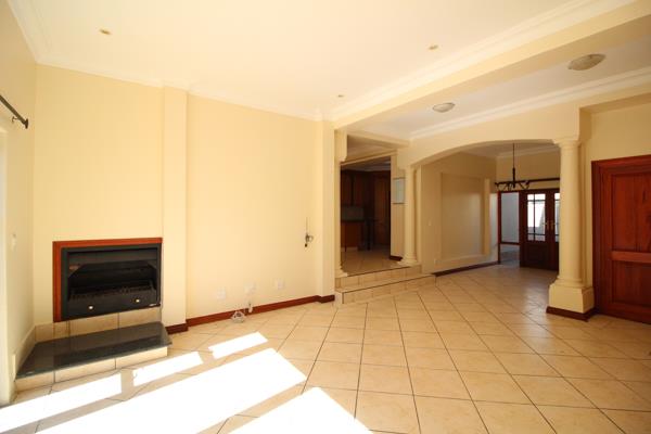 The heart of the home lies in the open-concept living and dining areas, where the solid oak kitchen enjoys a practical design and includes a Defy electric stove. This culinary space connects naturally to the dining area, creating a warm setting for everyday meals or informal gatherings. The adjacent lounge features a fireplace that adds a cosy touch in cooler months, while an enclosed patio with a built-in braai provides a year-round space to host and unwind. A second lounge or recreation room, complete with a built-in bar, extends the homes entertainment potential even further.