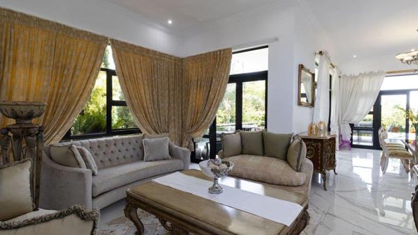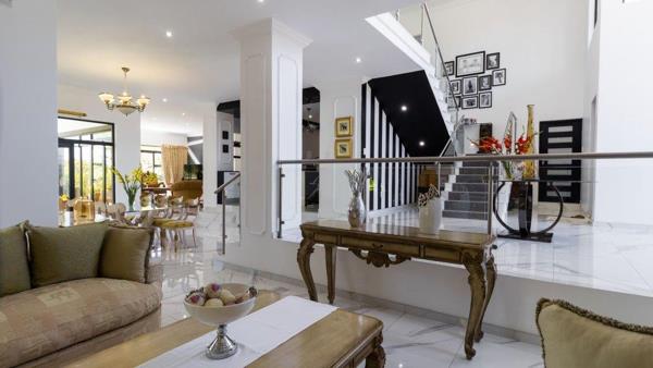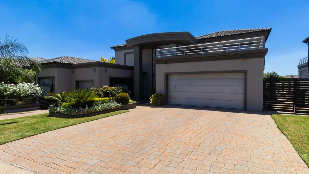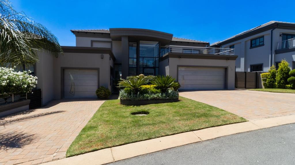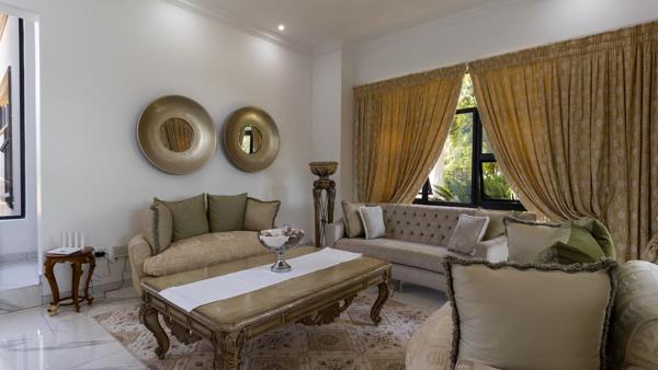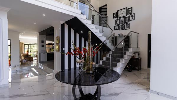 The home extends to a covered patio with a built-in braai, perfect for alfresco dining and entertaining, leading to a sparkling swimming pool. The garden is beautifully manicured, with an efficient irrigation system for easy upkeep. Additional features include staff accommodation, three automated garages, and a backup solar system to ensure energy efficiency and peace of mind during power outages.