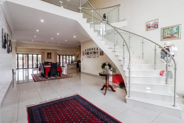 Location location location. Modern home nestled on the fairway boating a double volume entrance with high ceilings flowing onto the reception area leading onto open plan living areas and a very large modern kitchen with caeser stone tops and a breakfast nook. The family home has 4 bedrooms all en suite main with a walk in closet, pyjama lounge, study, guest toilet, formal lounge, patio with built in braai, swimming pool, staff accommodation, 3 automated garages and an automated irrigation system. The home boasts some of the best views of the estate.