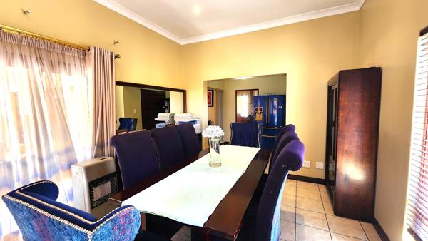 The heart of the home is the warm and inviting loungeTV area, complete with a fireplace for cozy evenings, and air-conditioning for comfort during warmer days. Step outside to the patio area, featuring a built-in braai, ideal for al fresco dining and entertaining guests. The dining room offers an elegant space for formal gatherings and memorable meals.
