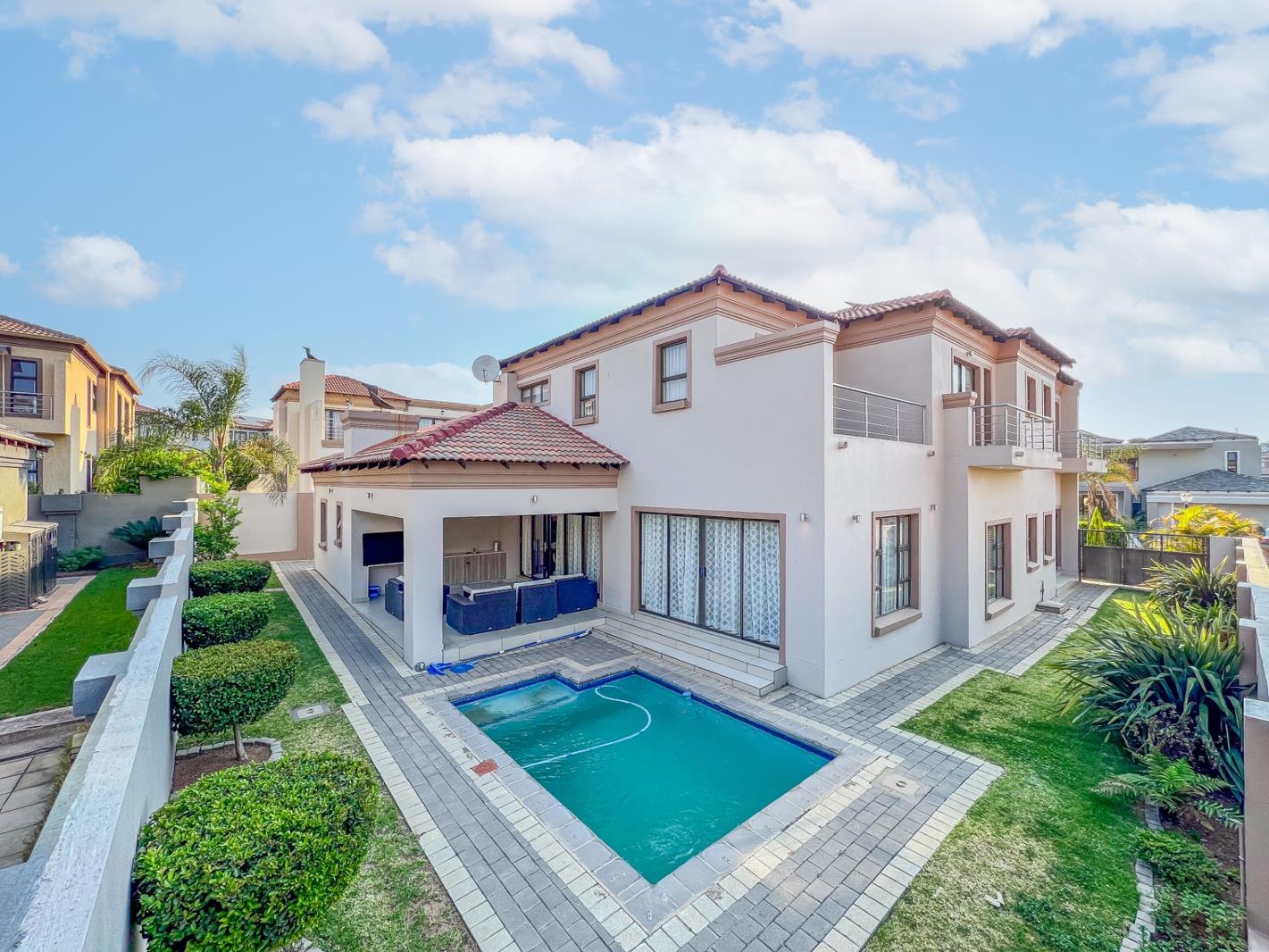 Sophistication and Elegance with an Entertainers Paradise!Ready to Move in Home: exceptionally well maintained.Prime location in the heart of Prestigious Blue Valley Golf Estate, you are welcomed with a captivating contemporary chandelier above an impressive floating stairway. This home exudes class as you step in with generous open-plan living areas with modern finishes. As you enter, a functional home office on your left with an adjacent guest bathroom. A spacious guest bedroom with an ensuite bathroom. The interior decorator fabulously designed this home with neutral colors of cream porcelain tiles, glossy cabinetry, and sophisticated ceilings with blended lighting that sets the tone for luxurious estate living.With a semi-closed private lounge, a seamlessly flowing open plan TV room and dining room lead into the undercover patio and sparkling pool area with a manicured private garden.A chef''s dream kitchen with a stunning centerpiece island fitted with 5 plate gas stove and breakfast nook, chatting to your guests while you cook your them a gourmet meal. A separate spacious pantry that packs away everything neatly, adjacent to the kitchen is a scullery and laundry with appliances and an electric stove with a back door to the courtyard and domestic helper''s room. Double garage with an inverter system to beat load-shedding.Inside:4 Bedrooms4 and a half BathroomsKitchenSculleryDining room3 Living AreasStudyPantryGuest toilet Outside:2 Garages with automated doorsPatio with braaiSparkling PoolComputerized irrigation AmenitiesEasy access to main road accessClose to sought-after public and private schools in Midrand and Centurion Large shopping centres in the area.Call to arrange your private viewing now!