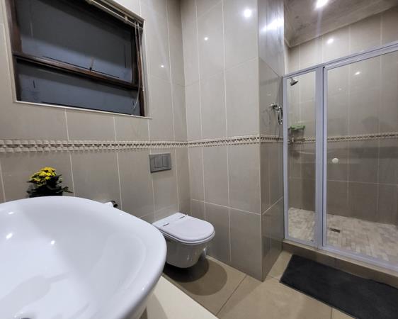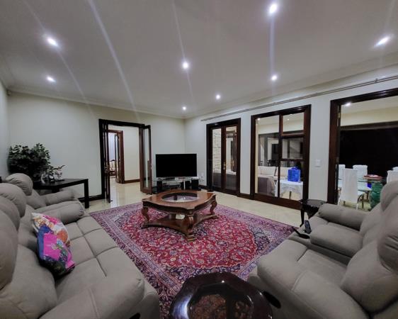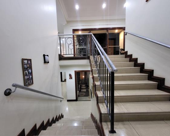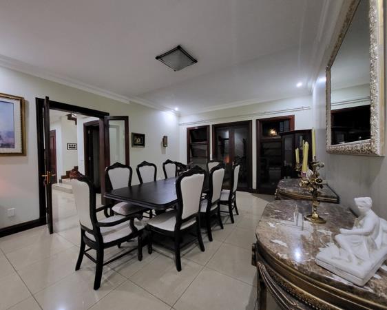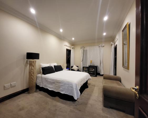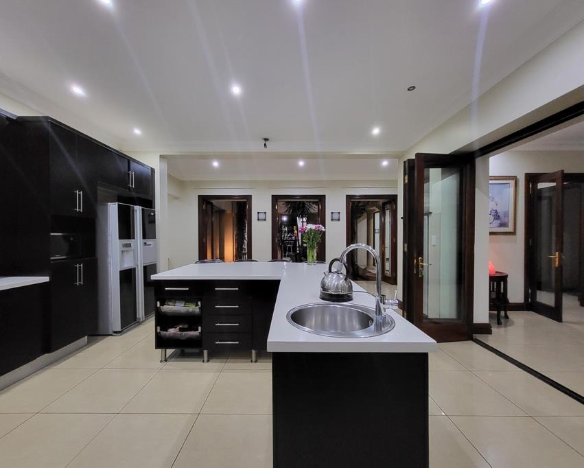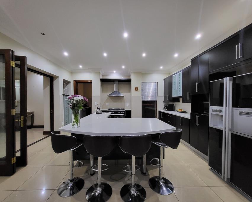 The spacious open plan kitchen is the dream of the master chef. The beautifully tiled kitchen is well endowed with finishes that speaks of good taste as it boasts beautiful cupboards, Caesarstone countertops, a large scullery and a center island. The in-door braai area opens up onto the patio as well as linking seamlessly with the entertainment room with its beautifully designed bar, pool table lounge and access to the atrium. The dining room is spacious and accommodates a 12-seater dinning suite with ease.