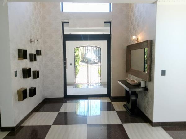 This is stunning heart designed Elegant home in one of the best Golf Estates in Gauteng. The 4 Bedroom, 4 Bathroom home has a covered entertainment area which can be easily converted into a gym or a bar. A beautifully timeless modern farm style kitchen with open spaces, 2 Lounges and a Dining room. In the winter this home provides an anthracite heater which warms up the whole ground floor area of the home. If you are person of space, definitely this is the home for you. The main bedroom occupies half of the 1st floor giving a whole movement and a private lounge within your bedroom. Swimming pool has rubber decking and water feature that can be manually regulated. An outside room with its own shower and 24 hrs security.