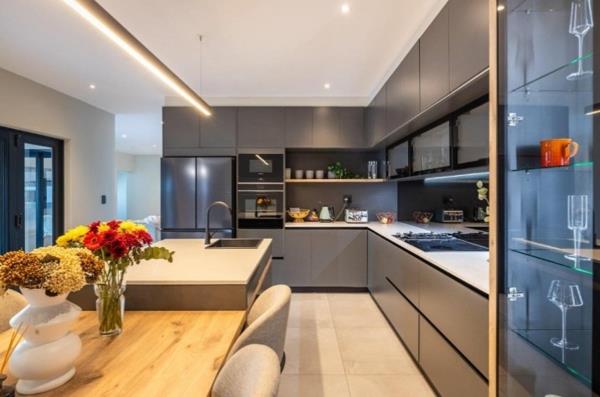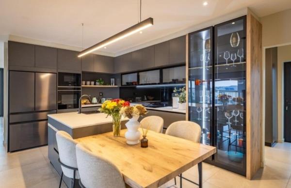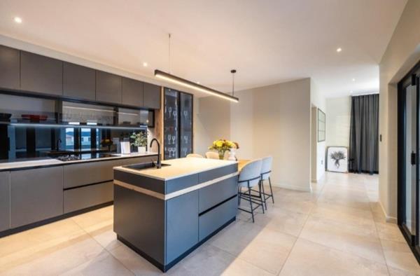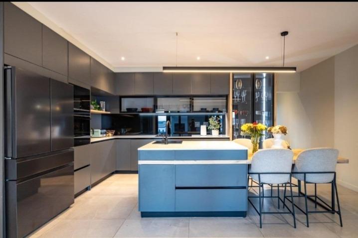 The modern kitchen is both functional and sophisticated, featuring a gas and electric combination hob, sleek finishes, and generous storageperfect for everything from quick meals to elegant dinner parties.