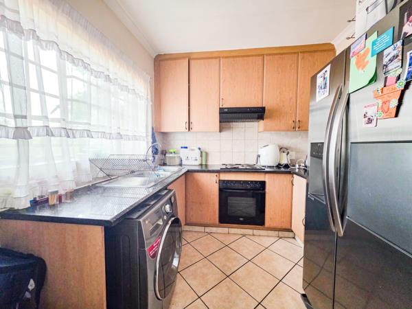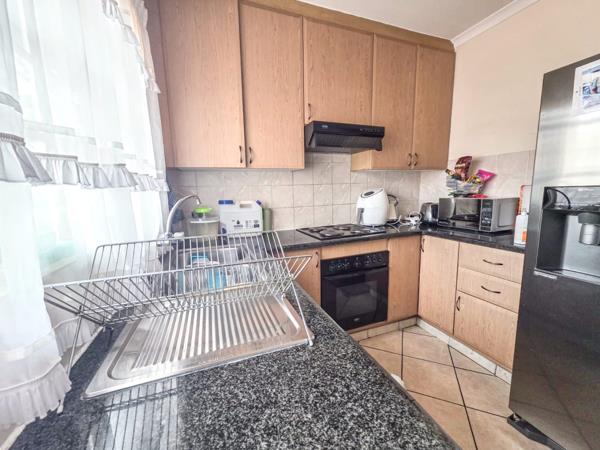 Outdoor living is enhanced by a private balcony, perfect for relaxation, and a built-in braai for entertaining. The convenience of two dedicated garages ensures secure parking. For peace of mind, the complex features an access gate, and the unit is secured with burglar bars and security gates. Fibre internet connectivity is also available.