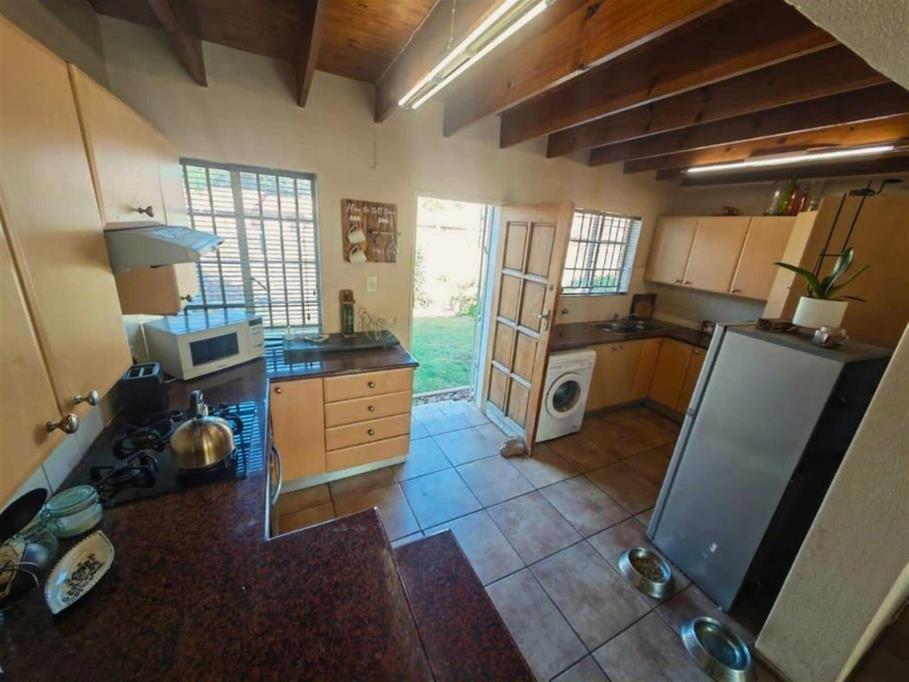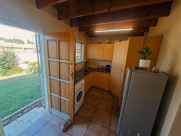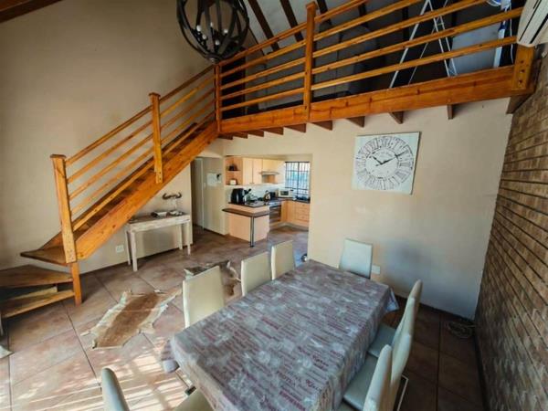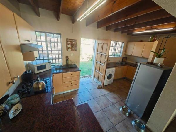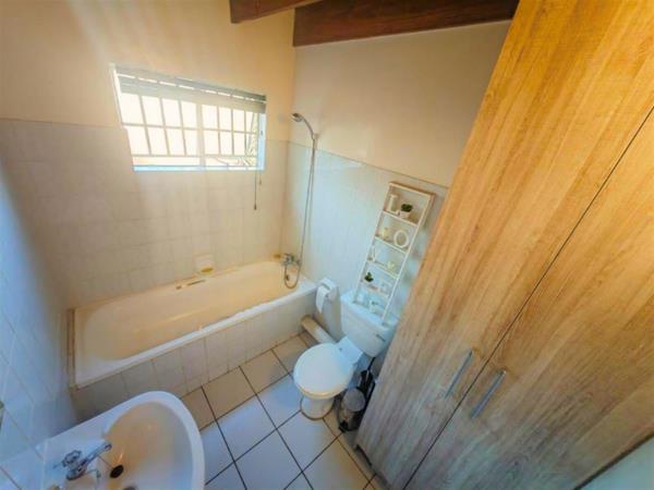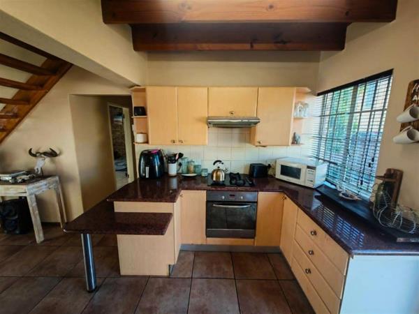 Practical touches extend outdoors. The lapa has been beautifully upgraded with low-maintenance tiles and a double built-in braai, ideal for hosting friends and family. A timer-controlled irrigation system keeps the garden lush, and water is included in the levies. Additional storage is available via a classic Wendy shed, while two covered parking bays ensure security and ease of access.