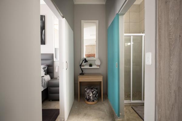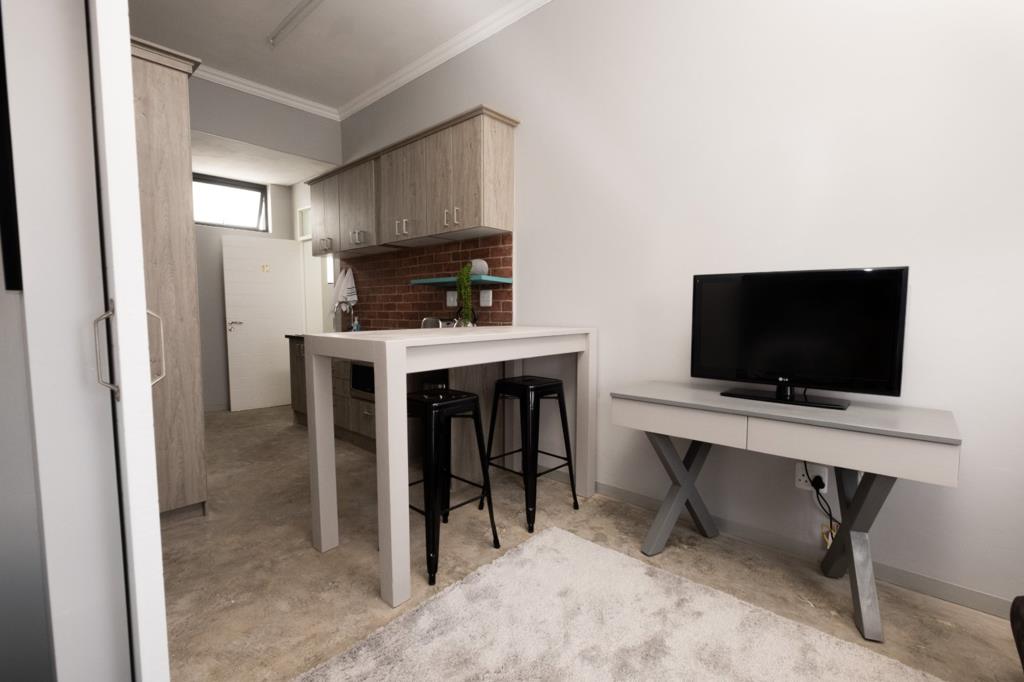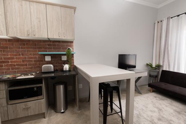 Open plan living and bedroom, tiles, Shower with toilet and Basin, small but effective kitchen.