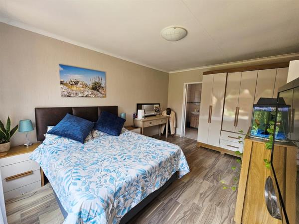 Abundant natural light floods the front of the house, including two of the roomy bedrooms. The main bedroom is impressively spacious, featuring laminate flooring, modern cupboards, and a newly renovated en-suite bathroom with a bath. The second bedroom comfortably fits a queen-size bed, and the third, a double. Both include built-in cupboards and share a neat bathroom with a shower.