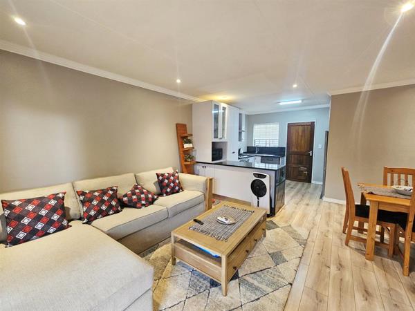 Enter via the garden gate into a well-established garden, under the patio roof, through the double glass doors into a stunning and immaculate 2-bedroom home, with laminate floors throughout except for the full bathroom and modern finishes. The light and airy, open plan living area flows into the modern kitchen, with ample, ultra-modern cupboard space, a double zinc, a gas hob, extractor fan, connections for both washing machine and a dishwasher and back door access to spacious courtyard with a handy wash-up trough.