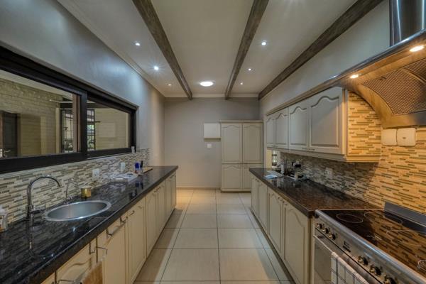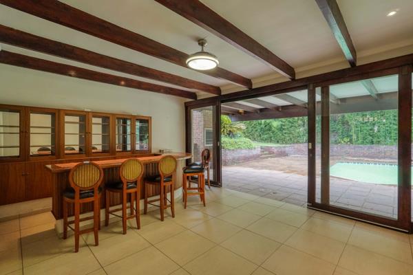 The kitchen is positioned off the lounge and is accessed independently, featuring a practical layout with a scullery that opens directly to the garden. The dining area is separate from the kitchen and flows into a dedicated party room complete with a built-in bar. This entertainment space opens to the backyard, where a covered patio with a built-in braai overlooks the swimming pool, creating an ideal setting for social gatherings.