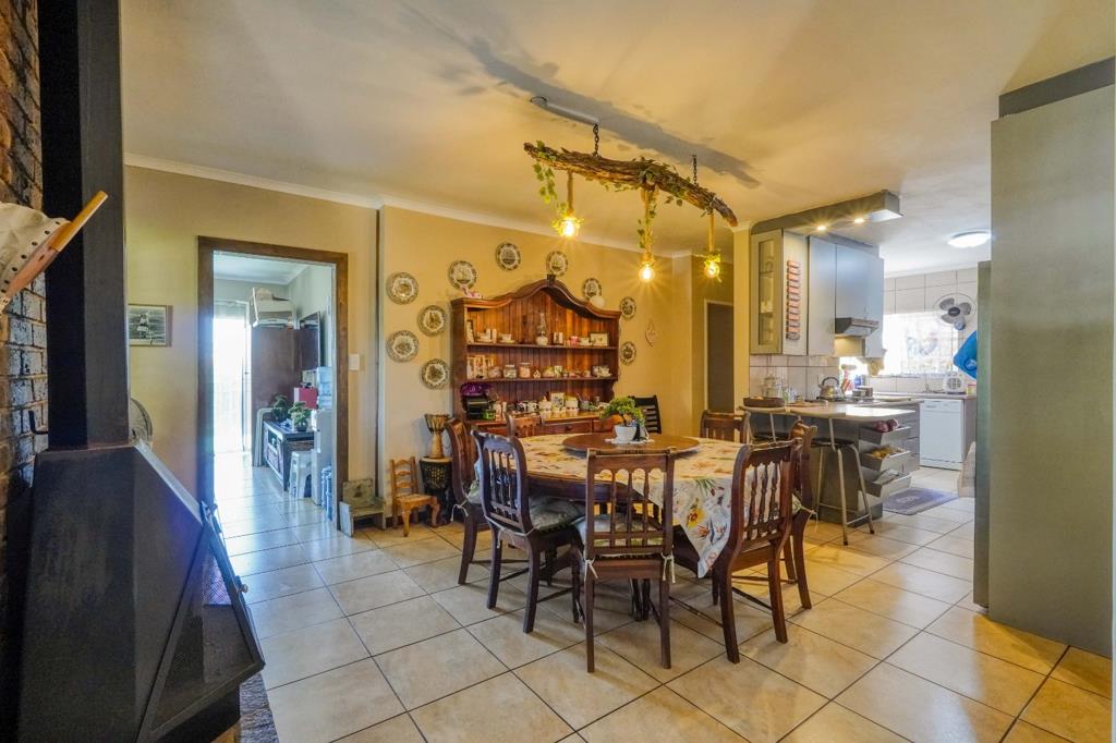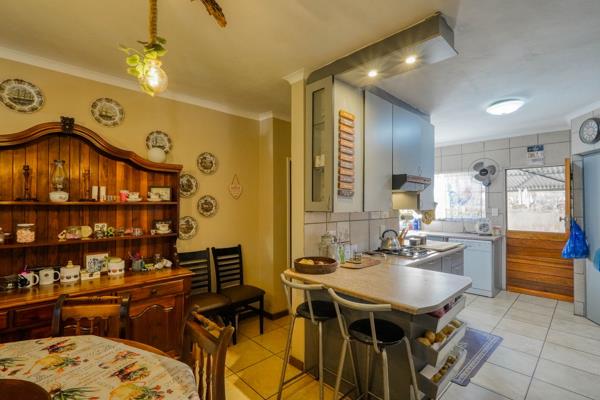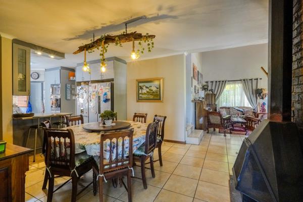 At the heart of the home is the dining room, which connects seamlessly to two lounges and the kitchen, creating a natural hub for everyday life. The lounge near the entrance opens onto the patio with a built-in braai and bar, making it ideal for relaxed entertaining. The kitchen is well positioned and links to a small hallway with a guest toilet, handy storage space, and direct access to the garage, keeping the layout practical and efficient.