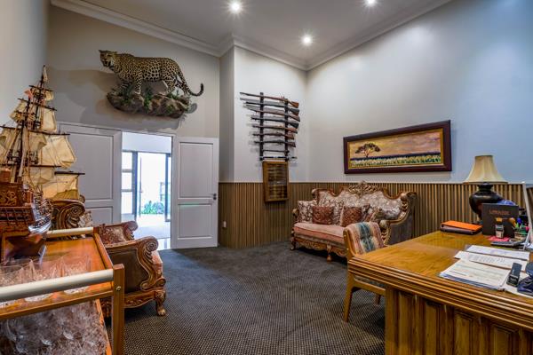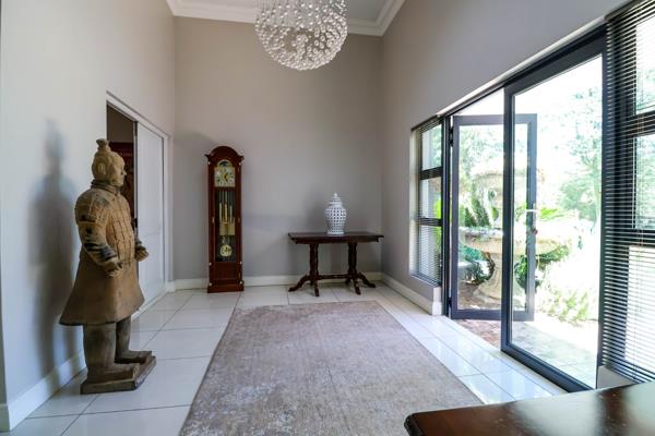 Designed with leisure in mind, the home boasts a fully equipped private cinema with high-end sound and plush seating, creating an immersive viewing experience. The elegant formal lounge with a cosy fireplace, alongside a sunken built-in bar with braai, and an expansive dining room, provide a variety of sophisticated spaces for hosting. The dining area opens out onto a beautifully manicured garden, where uninterrupted views of the adjacent golf course create a serene and picturesque backdrop.