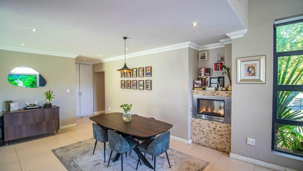 Open plan lounge and dining with gas fireplace, aircon and open trusses