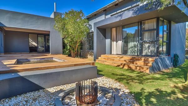 Covered patio with built in braai overlooks splash pool, manicured garden and park