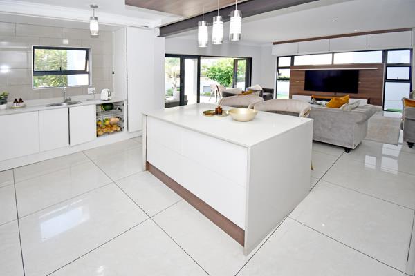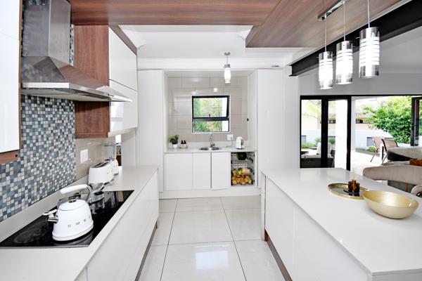 The kitchen is modern and fresh with a clean white finish and leads through to a separate scullery. From here, there is direct access to the staff accommodation as well as internal access to the garage, adding excellent functionality.
