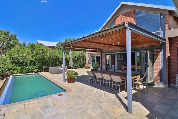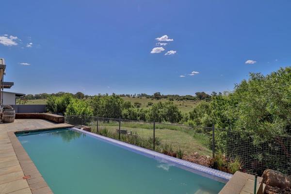 Covered patio with roller blinds overlooking rim flow lap pool and farm