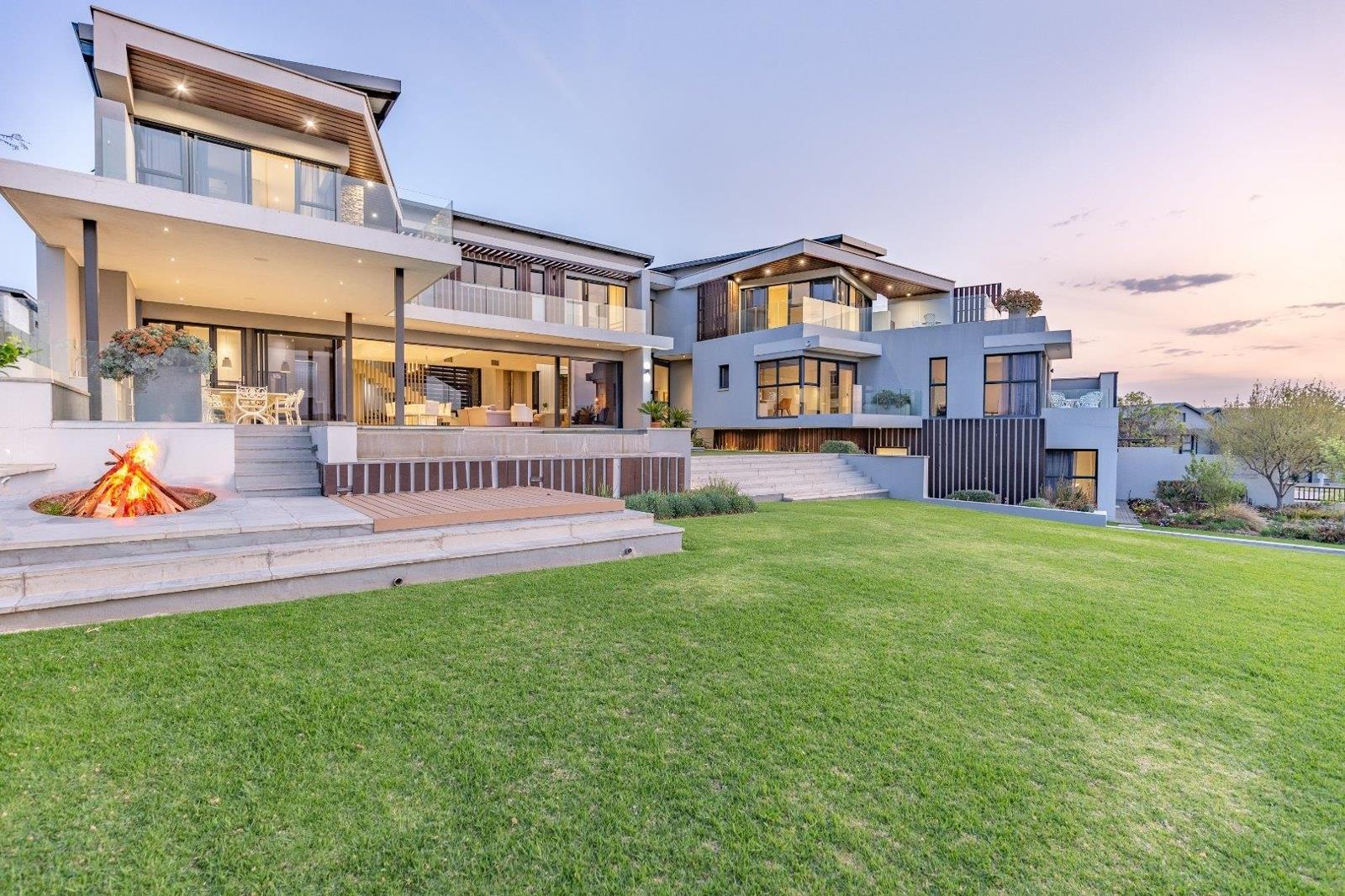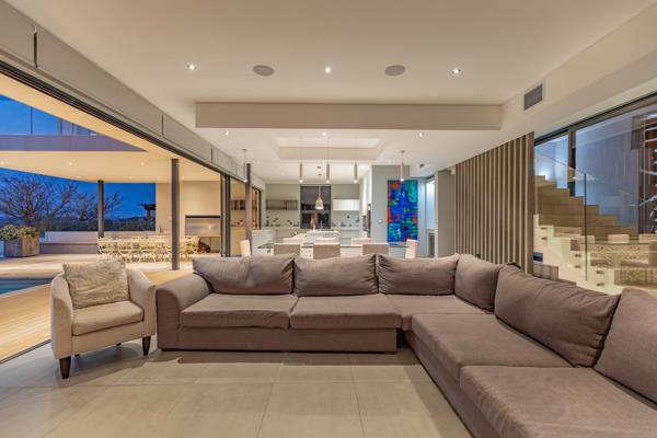 The ground floor is the heart of this magnificent retreat, designed with entertainment and relaxation in mind. Whether you''re enjoying a cozy movie night in the spacious family lounge, hosting a delightful dinner party in the open-plan dining area, or preparing gourmet meals in the fully equipped kitchen, this home provides the ideal setting for creating unforgettable moments. Step outside to the alfresco deck, where an infinity-edge pool and meticulously manicured garden offer the perfect backdrop for relaxation and enjoyment. Additional highlights include a gourmet kitchen with top-of-the-line appliances, a full laundry room kitted with a laundry shoot with washer and dryer, a fireplace, numerous aircons, two double garages with built-in cupboards and extra storage space, integrated Wi-Fi and home audio systems, staff quarters with a bedroom and shower, and an outdoor gas braai and firepit for al fresco entertaining. As you ascend the illuminated staircase, you''ll discover four private suites, each thoughtfully designed to provide enhanced privacy within pavilion-style structures. The main suite is a sanctuary in itself, featuring a spa-like bathroom, an expansive dressing room, and sliding doors that open onto a private terrace with captivating views. For added versatility, this property offers five bedrooms, including a one-bedroom flatlet, perfect for guests or as a separate living space.