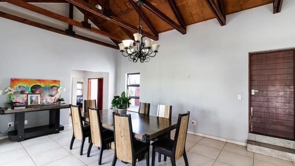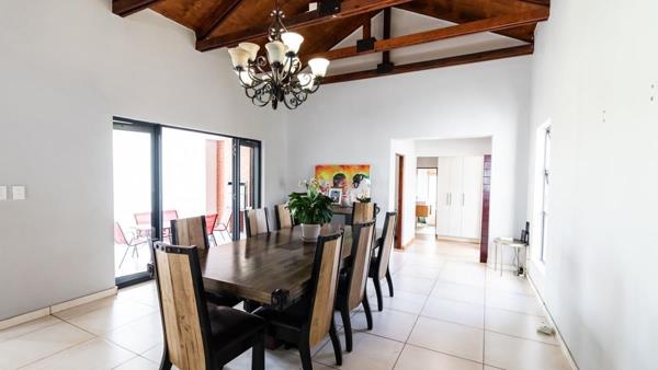 Spacious lounge with open trusses access to covered patio and garden