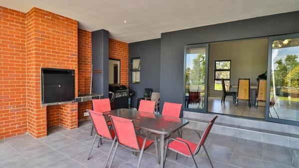 Covered patio with built in braai overlooks garden and park