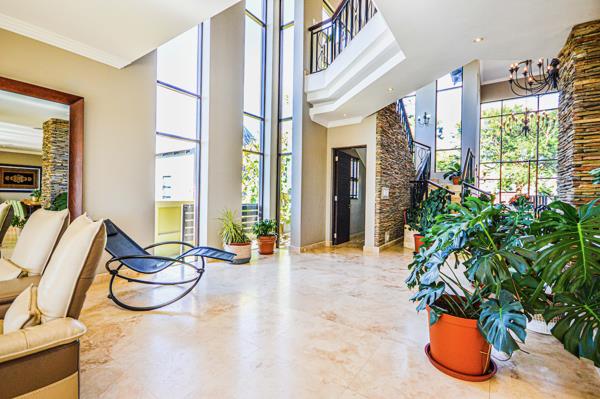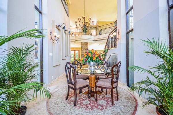 A grand entrance with chandelier and beautiful staircase welcomes all to this stunning home. The large windows allow for excellent light flow throughout the house. This home is cleverly divided into functional living areas boasting both space and excellent flow from one room to another. The picture is completed with a double sided gas fireplace. The stylish kitchen features a combination of Caesar stone and wood finish tops, and has a separate pantry, scullery and washing up area. A lovely guest suite, downstairs, over looks the fabulous pool and manicured garden. Upstairs are the three en-suite spacious, luxurious bedrooms and bathrooms. The master bedroom has a large dressing room, as well as a luxurious en-suite bathroom and a pyjama lounge brings it all together.