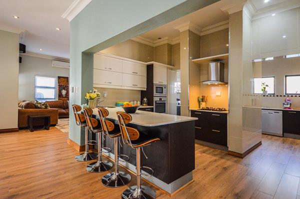 This exquisite home offers space for the whole family, the home is modern and well designed. You have stunning views of the home as you enter the spacious double volume entrance hall with a magnificent staircase and chandelier that leads you to the 4 bedrooms, 2 studies and the pajama lounge upstairs. The ground floor has an open plan design, yet you have an element of privacy, you are welcomed by the cosines of the formal lounge with a fireplace, the lounge opens onto the pool are with sliding doors. The kitchen is modern and well designed with a huge walk-in pantry and a scullery that could serve as a 2nd kitchen, the kitchen is open plan to the dining room. The spacious family room is just off the dining room and kitchen, the dining room opens onto the covered patio. The covered patio has 3 defined spaces - the braai area the comfortable lounge and then the games room, all which opens onto the deck and pool.
