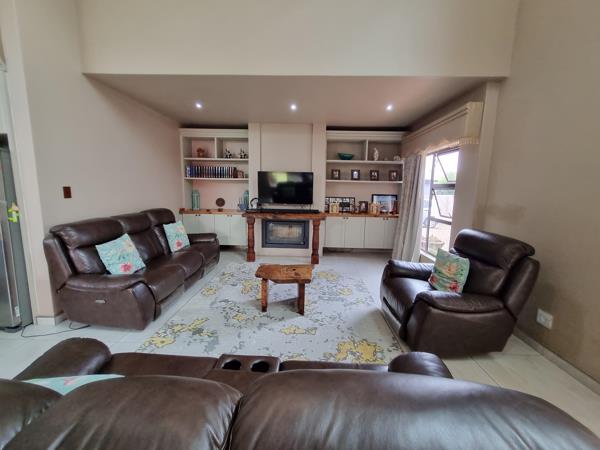Open plan lounge with wood fireplace and stackers to the covered patio