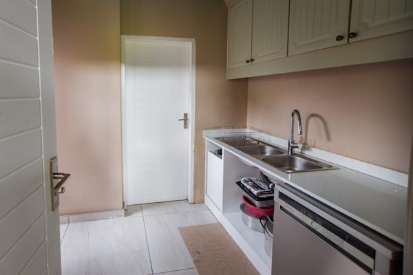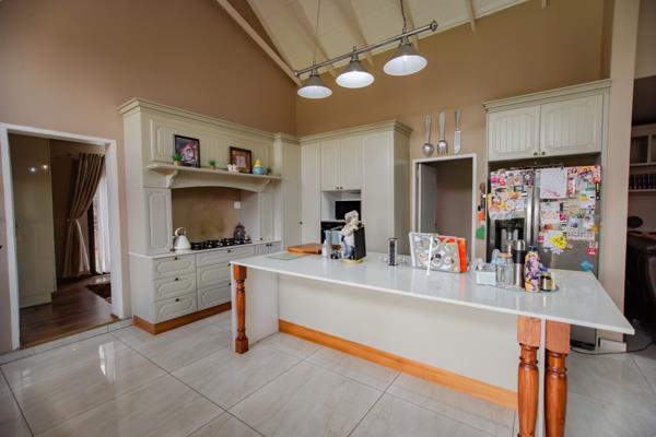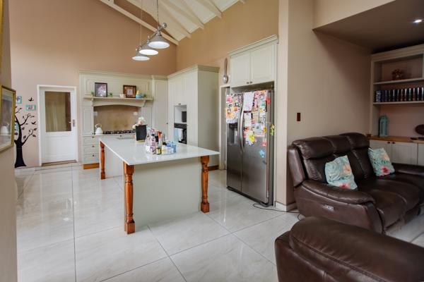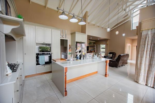 The home welcomes you into a spacious open-plan living area, featuring a farm-style kitchen with a gas stove, built-in oven, space for a double-door fridge, and room for three appliances. A separate scullery and dedicated ironing room add convenience.