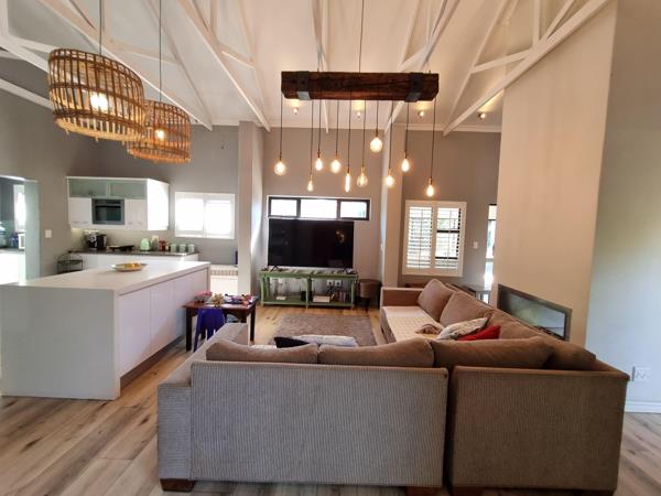Open plan living spaces of lounge and dining with open trusses and gas fireplace and aircon