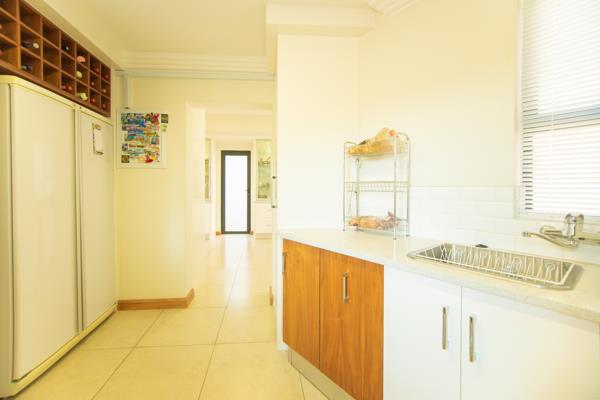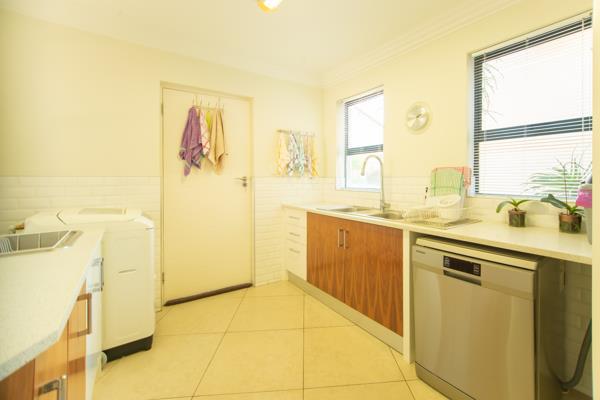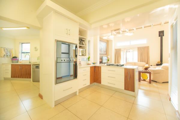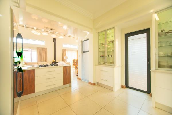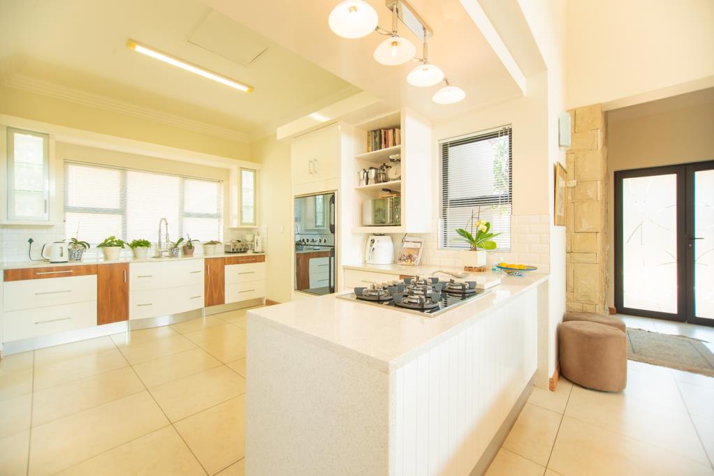 The thoughtfully designed kitchen is a masterpiece in both style and functionality. Featuring sleek Caesarstone countertops, a gas hob, and a Defy double thermo fan eye-level oven, it is an inspiring space for culinary creations. Ample counter and cupboard space ensure effortless organisation, while the adjacent dining room, illuminated by statement lighting, sets the stage for memorable meals with family and friends.